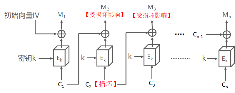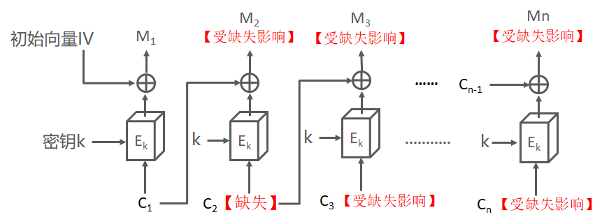 但是,如果不是数据出错,而是密文分组中有比特缺失,那么即使丢失一个比特,也会导致密文分组的长度发生变化,后续的分组发生错位,最终导致后面的所有密文分组都会解密出无效的数据。