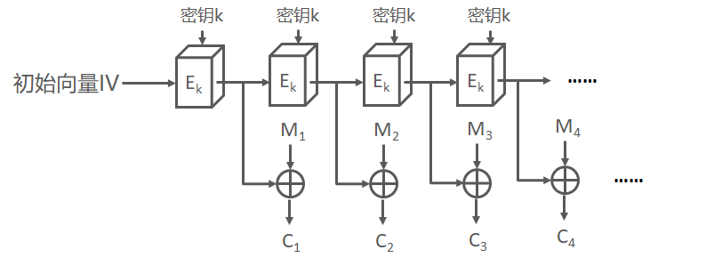 这是分组加密最简单的一种模式,即明文的每一个块加密成密文的每一个块。明文被分为若干块$(M_1,M_2,M_3,M_4, … ,M_n)$,通过加密方法$E_k$,得到密文$(C_1,C_2,C_3,C_4,…,C_n)$,当最后一个明文分组小于分组长度时,需要用一些特定的数据进行填充。