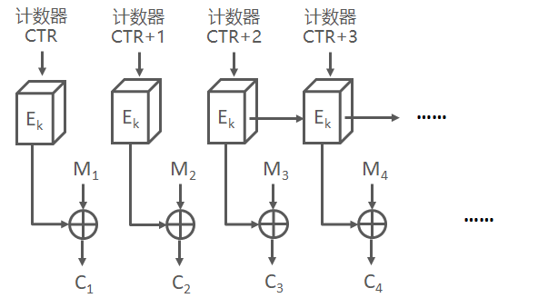 CTR模式中,每个分组对应一个逐次累加的计数器,并通过对计数器进行加密来生成密钥流。也就是说,最终的密文分组是通过将计数器加密得到的比特流,与明文分组进行XOR运算得到的。