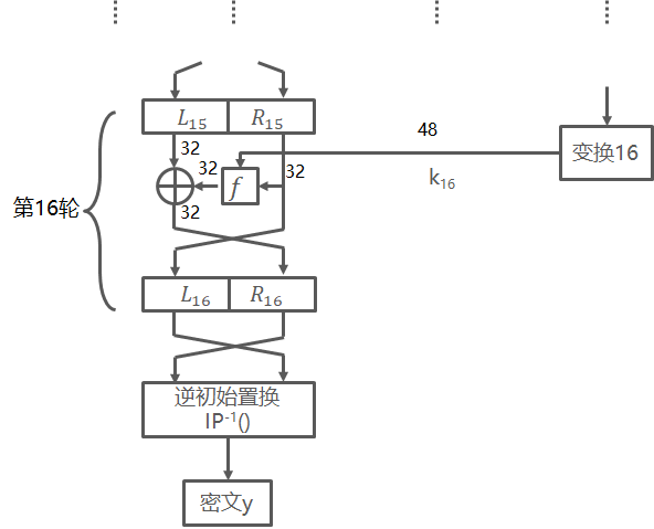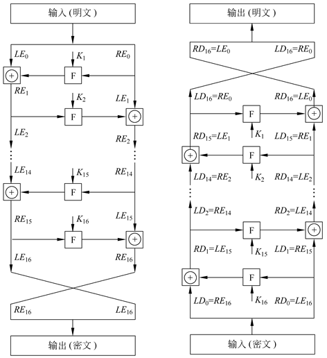 所以解密过程第1轮的输出为LE15‖RE15,等于加密过程第16轮输入左右两半交换后的结果。容易证明这种对应关系在16轮中每轮都成立。一般地,加密过程的第i轮有 $LEi=RE{i-1}$ $REi=LE{i-1}\bigoplus F(RE{i-1},K{i})$ 因此 $RE{i-1}=LE_i$ $LE{i-1}=REi \bigoplus F(RE{i-1},K_i)=RE_i \bigoplus F(LE_i,K_i)$