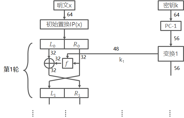 根据Feistel算法可知,在每一轮中,实际是将右半部分Ri送入函数f中,函数的输出将与32位的左半部分Li进行XOR运算,最后左右交换。
