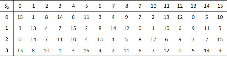 S-盒 S盒是DES的核心,它将6位的输入映射为4位的输出,为DES提供了非线性特征,这意味着即使给定一个输入-输出值的集合,也很难预估所有S盒的输出。 尽管NBS/NIST早在1977年就发布DES的完整规范,但却从来没有完整披露过S-盒表的选择动机。这个事实引发了人们的很多猜测,尤其是关于是否存在只有NSA才能破解的秘密后门的可能性或一些其他故意构造的缺陷。 对每个盒Si,其6比特输入中,第1个和第6个比特形成一个2位二进制数,用来选择Si的4个代换中的一个。6比特输入中,中间4位用来选择列。行和列选定后,得到其交叉位置的十进制数,将这个数表示为4位二进制数即得这一S盒的输出。