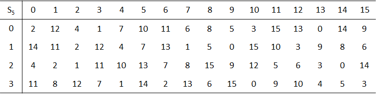 例如,S1 的输入为011001,行选为01(即第1行),列选为1100(即第12列),行列交叉位置的数为9,其4位二进制表示为1001,所以S1的输出为1001。 S盒的每一行定义了一个可逆代换。