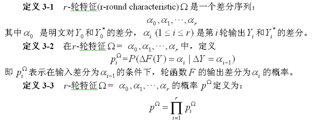 $$\Delta Y{0}, \Delta Y{1},..., \Delta Y{r}$$ 其中$Y_0$和$Y_0^{}$是明文对,$Y_i$和$Y_i^{}$(1≤i≤r)是第i轮的输出,它们同时也是第i+1轮的输入。第i轮的子密钥记为$K_i$,F是轮函数,且$Y_i=F(Y{i-1}, $K_i$)$。